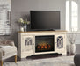 Elevating the art of traditional cottage styling, this TV stand with fireplace insert is beautifully in tune with your taste. Its antiqued two-tone aesthetic blends a chipped white with a distressed wood-tone top for added charm. The cabinet doors, with decorative fretwork over mirrored glass, add a lovely twist. And what really turns up the heat: an electric infrared fireplace insert with faux firebrick surround that operates with or without infrared heat. With the touch of a button, adjust the temperature and the flame brightness, and set the timer for long-lasting enjoyment.