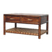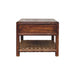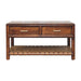 • Features: 100% solid mango wood,Chestnut finish,two compact drawers,brass handles,handcrafted,sustainable