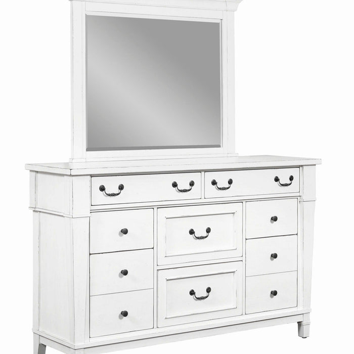 - The Stoney Creek mirror offers large-scale designs combined with a textured, antiqued white finish. Giving additional charm, the antiqued, blackened metal hardware and tapered leg details complete this relaxing retreat.