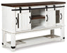 To those with an appetite for rustic farmhouse living, this server dishes out irresistible form and function. A pair of cabinet doors with mesh wire inlays add a countrified cool element. Sliding “barn doors” revealing even more shelved storage are right on trend. This server’s two-tone aesthetic pairs a distressed vintage white with an aged natural pine color top for twice the charm.